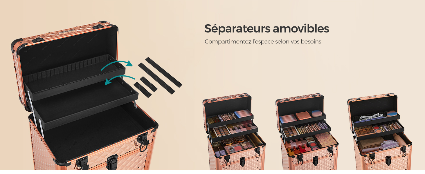 [Espace compartimenté] La mallette du haut est équipée de 4 séparateurs amovibles,elle est parfaite pour les petits objets comme les rouges à lèvres et les ombres à paupières. Les 2 grands tiroirs du bas sont prévus pour votre sèche-cheveux ou lampe à UV
